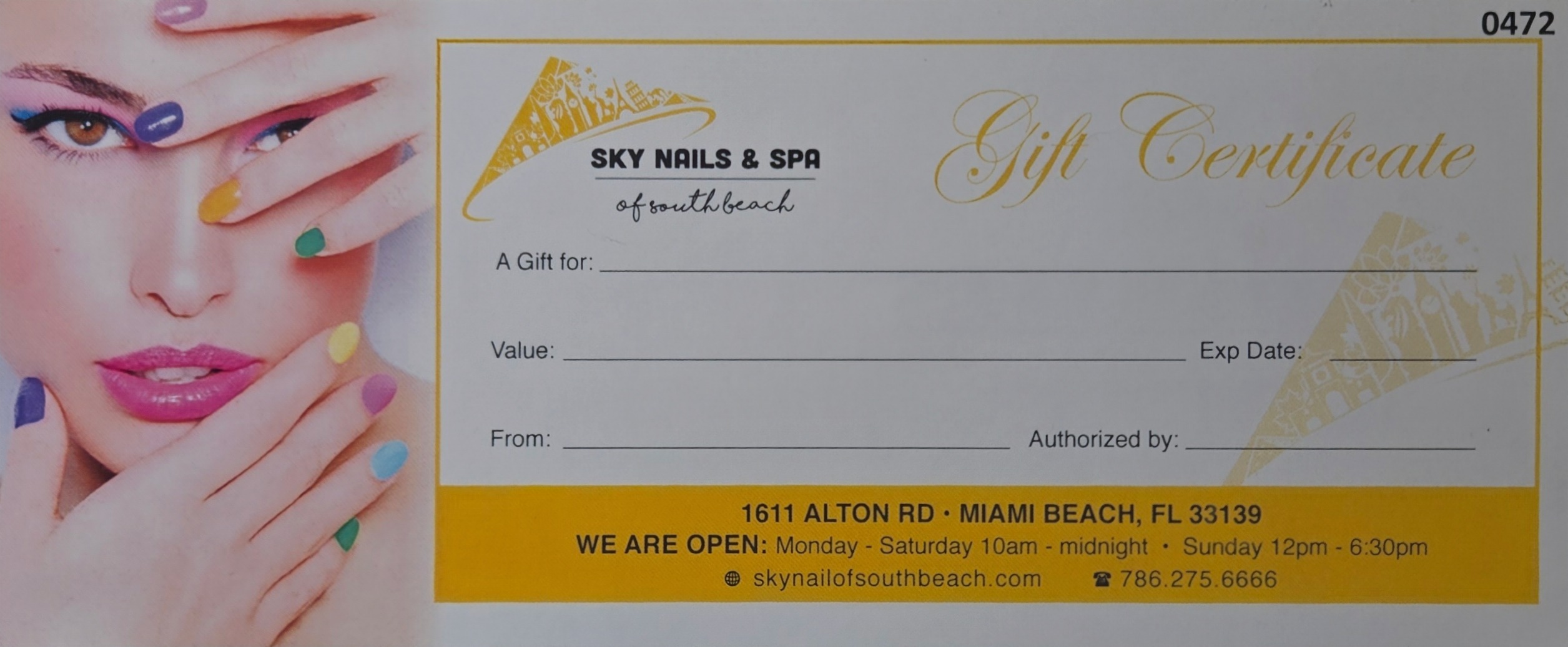 Sky Nails & Spa of South Beach is offering gift cards of various values, which are valid for any service offered at the salon. They come as either a physical card, which can be collected at the salon, or a virtual card delivered to you via email. Physical cards can be purchased by phone or in person while virtual cards can be purchased online. To redeem it, one must present either the physical card or the email with the card code at the reception and the card value will be deducted from the bill at checkout. We hope you enjoy this service!